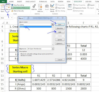Name your Macro "Series", set up a shortcut key of "S", add description of what your program will do "Macro to calculate voltage drops and current for 3 resistors connected in series"
